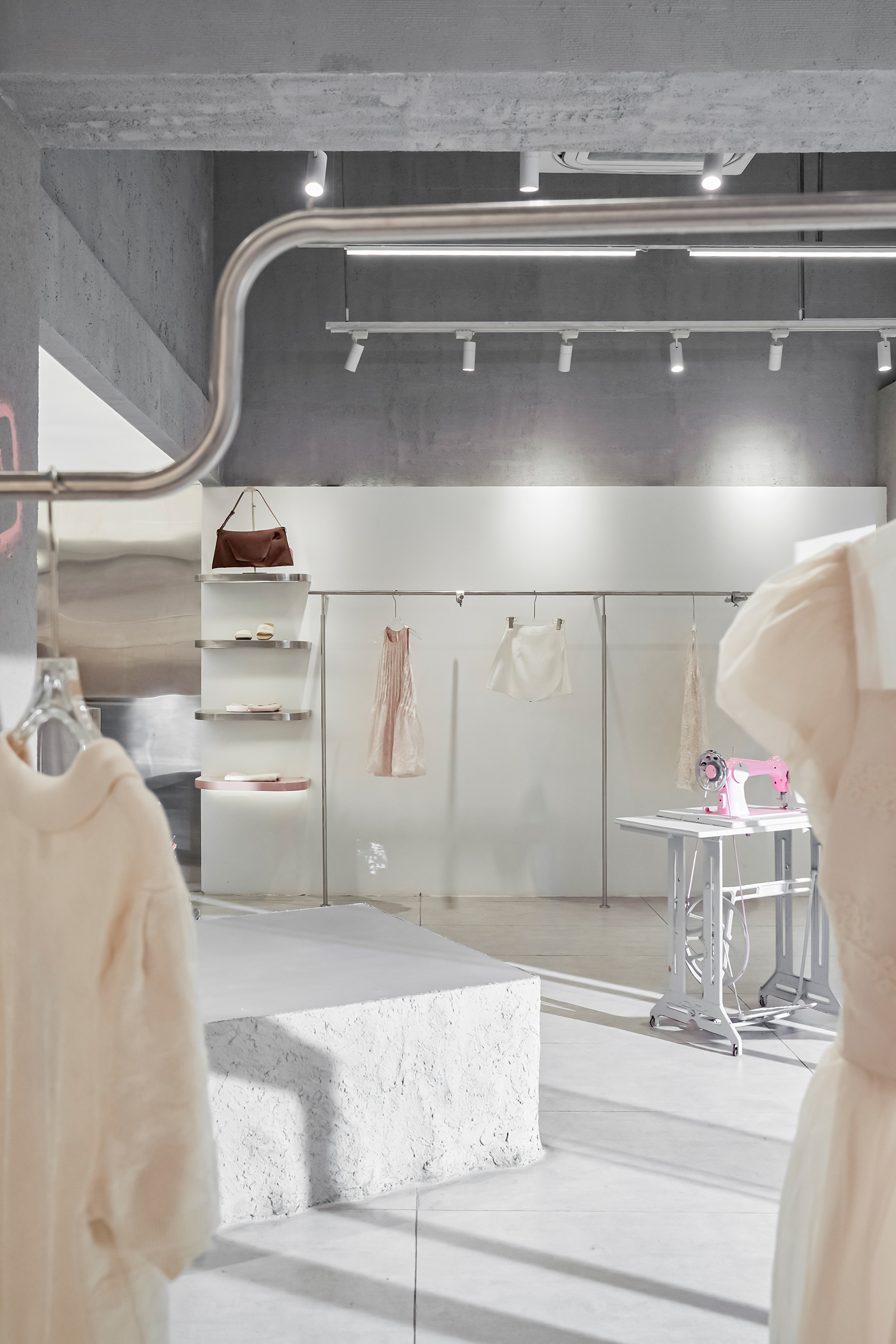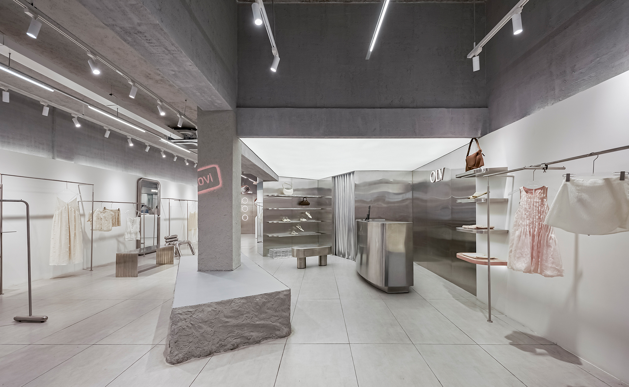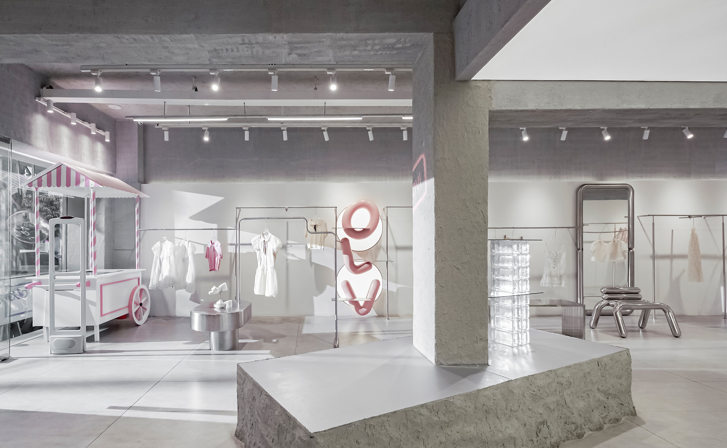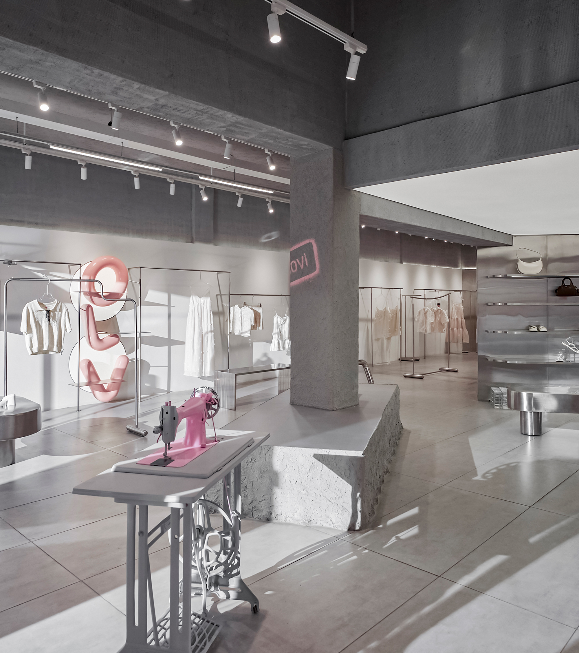 The new store embraces a modern Industrial spirit with concrete textures, raw stone, and brushed stainless steel bring strength and character, while delicate touches of pink weave in balance and emotion.