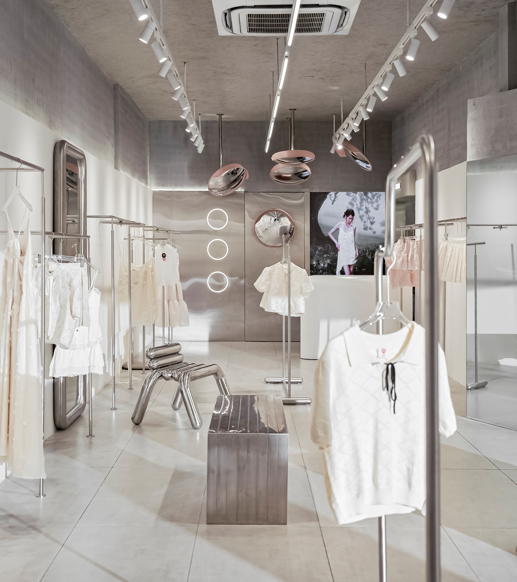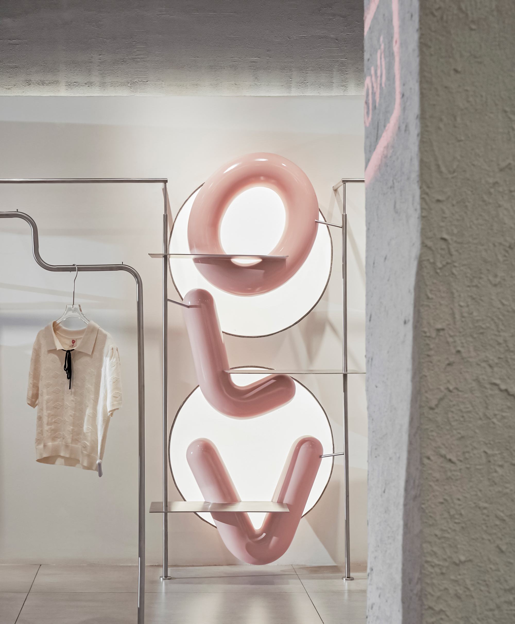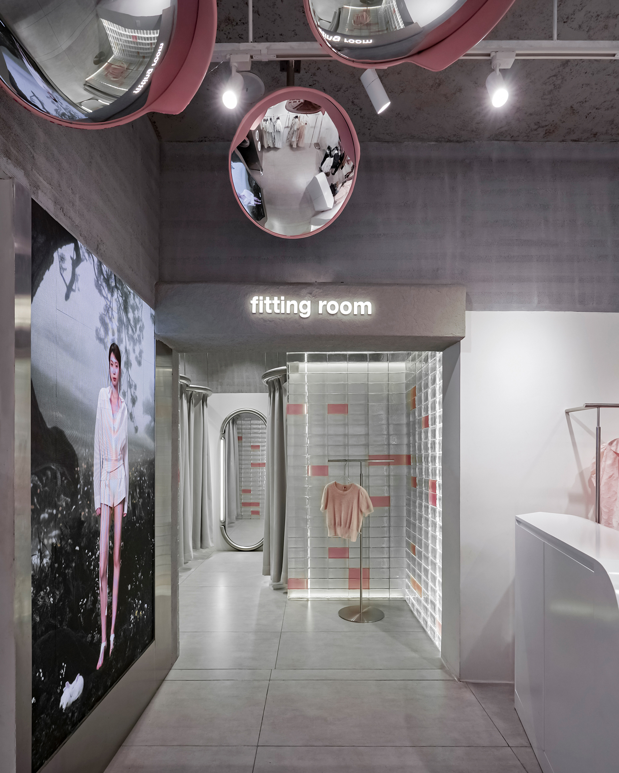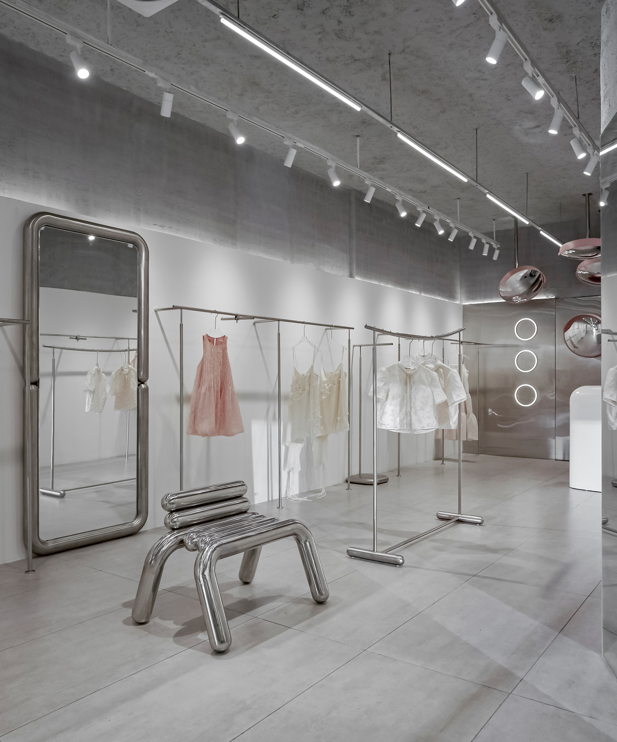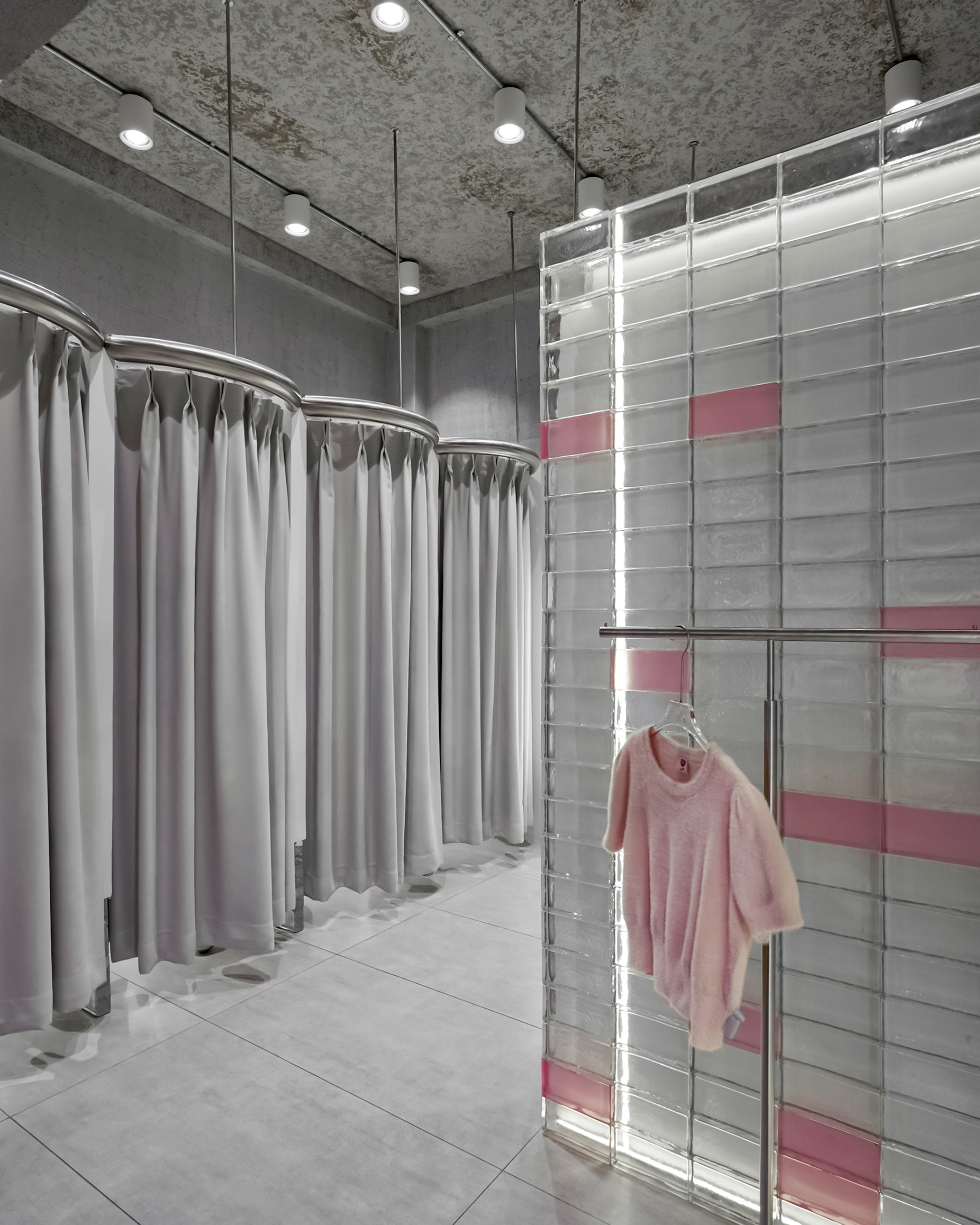 The new store embraces a modern Industrial spirit with concrete textures, raw stone, and brushed stainless steel bring strength and character, while delicate touches of pink weave in balance and emotion.